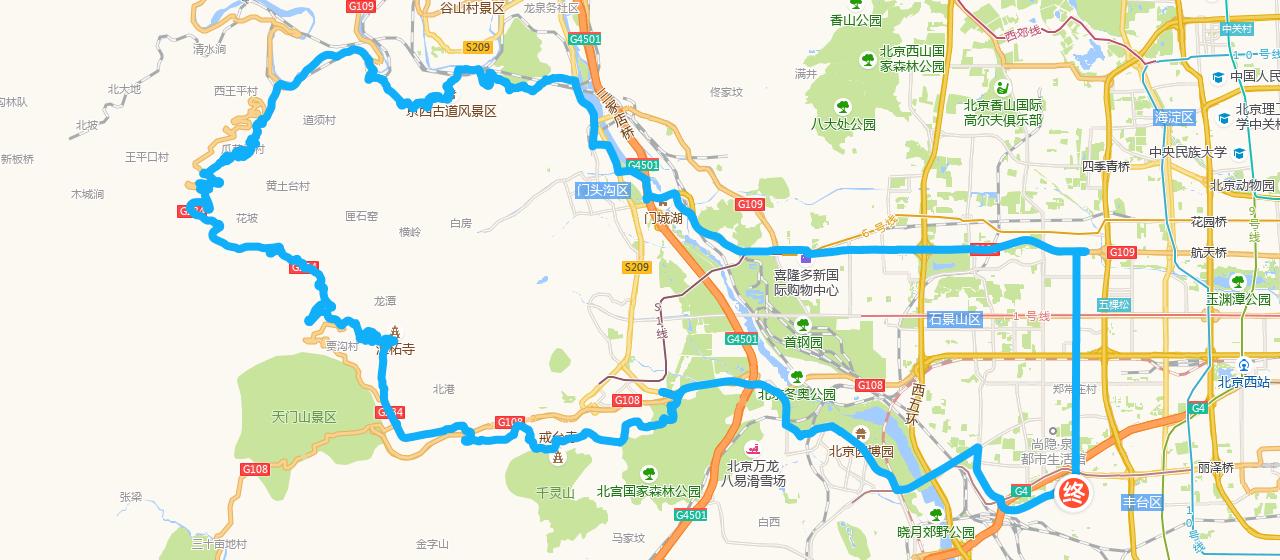 五里店出发,途径戒台寺、潭柘寺、潭王路、担礼隧道,阜石路,沿永定路青塔路程庄路终回五里店