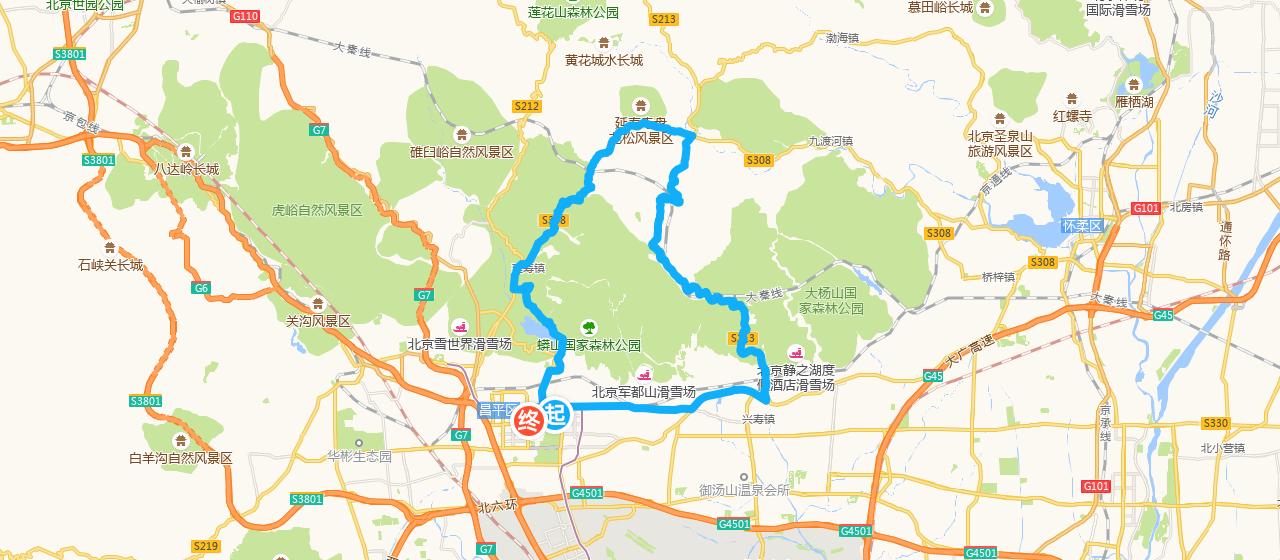 昌平东关沃尔玛出发,途径莽山国家森林公园-十三陵水库-长陵镇-(沙岭)-(黑山寨村)-延寿镇-(慈悲峪村)-兴寿镇-崔村镇-南邵镇,终点返回中国石油大学(北门)。全程约70公里,其中上坡约20公里,长