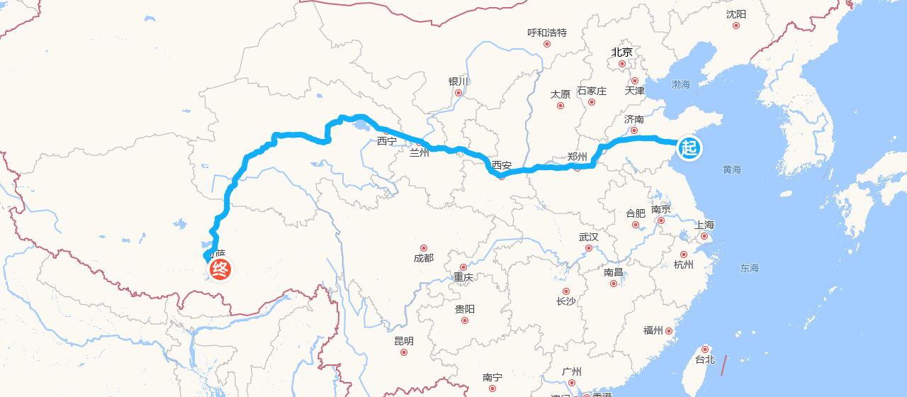 青岛—泰安—濮阳—开封—郑州—洛阳—三门峡—西安—宝鸡—天水—兰州—西宁—格尔木—五道梁—沱沱河—唐古拉山口—那曲—当雄—羊八井—拉萨